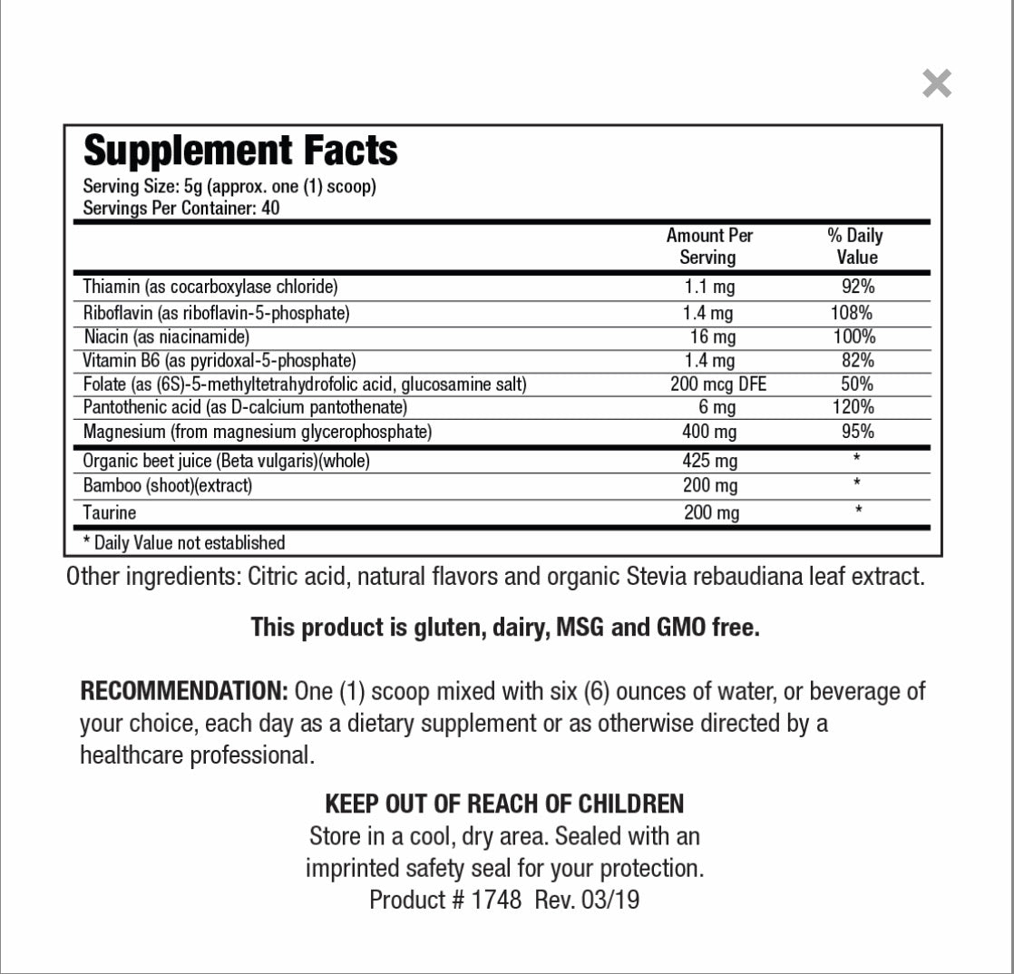 Esta fórmula contiene múltiples nutrientes con una alta dosis de magnesio bio disponible, además de taurina, vitaminas B y extracto de brotes de bambú. Se ha demostrado que el magnesio y la taurina, cuando se usan juntos, son cardioprotectores, ayudan a reducir la hipertensión y apoyan la función renal saludable. Las vitaminas B son nutrientes esenciales, responsables de miles de procesos en el cuerpo y cruciales para la producción y el equilibrio adecuados de energía. El brote de bambú es rico en silicio, un mineral que ayuda a llevar tanto el magnesio como el calcio a sus lugares adecuados para una salud óptima.