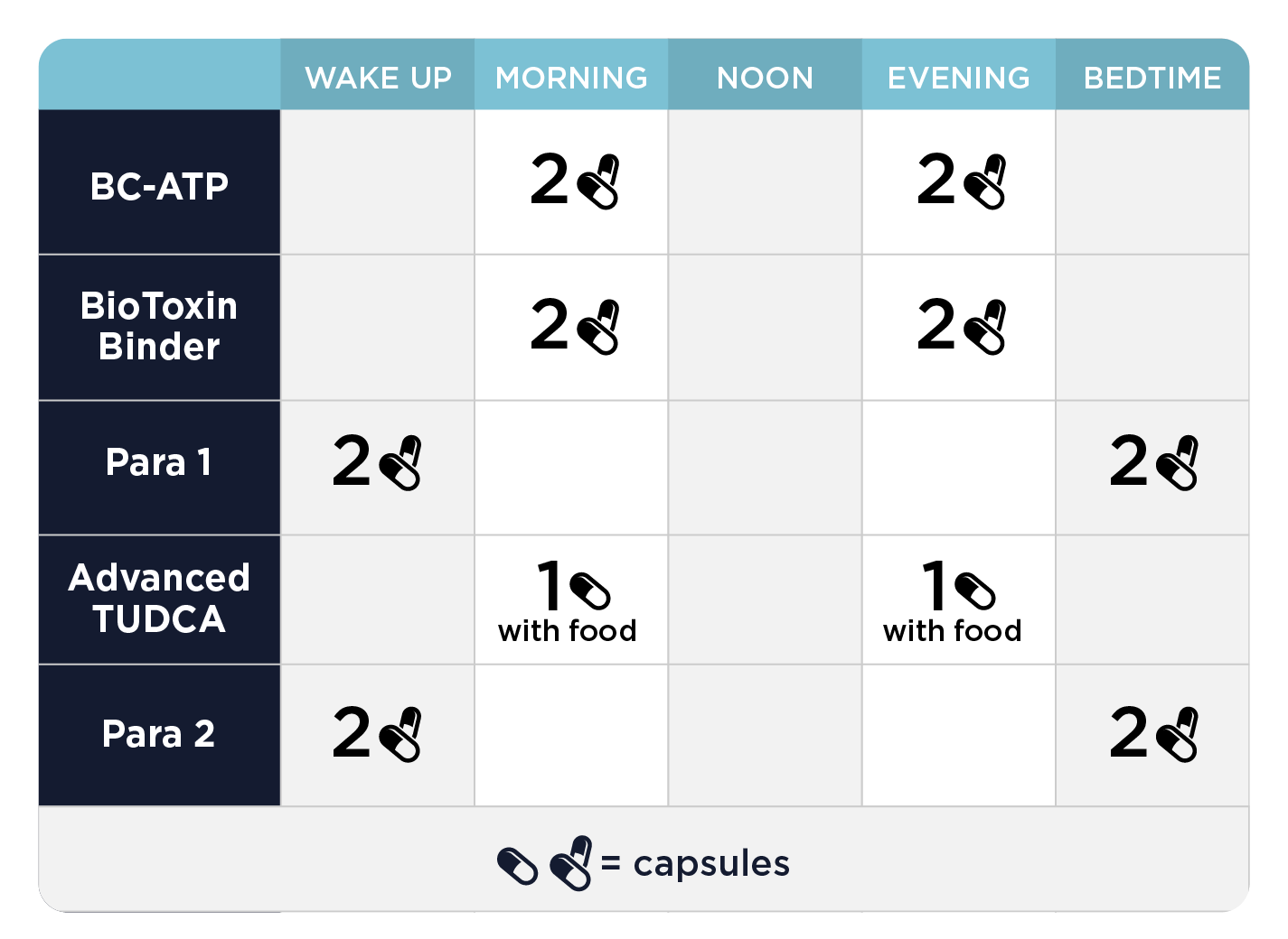 Advanced TUDCA se introduce en esta fase para promover el flujo biliar saludable y apoyar la salud del hígado, los cuales son esenciales para optimizar los procesos naturales de drenaje y desintoxicación del cuerpo.* Los pacientes continuarán tomando BC-ATP y BioToxin Binder para apoyar la función digestiva, la energía niveles, la función mitocondrial y la salud inmunológica.*