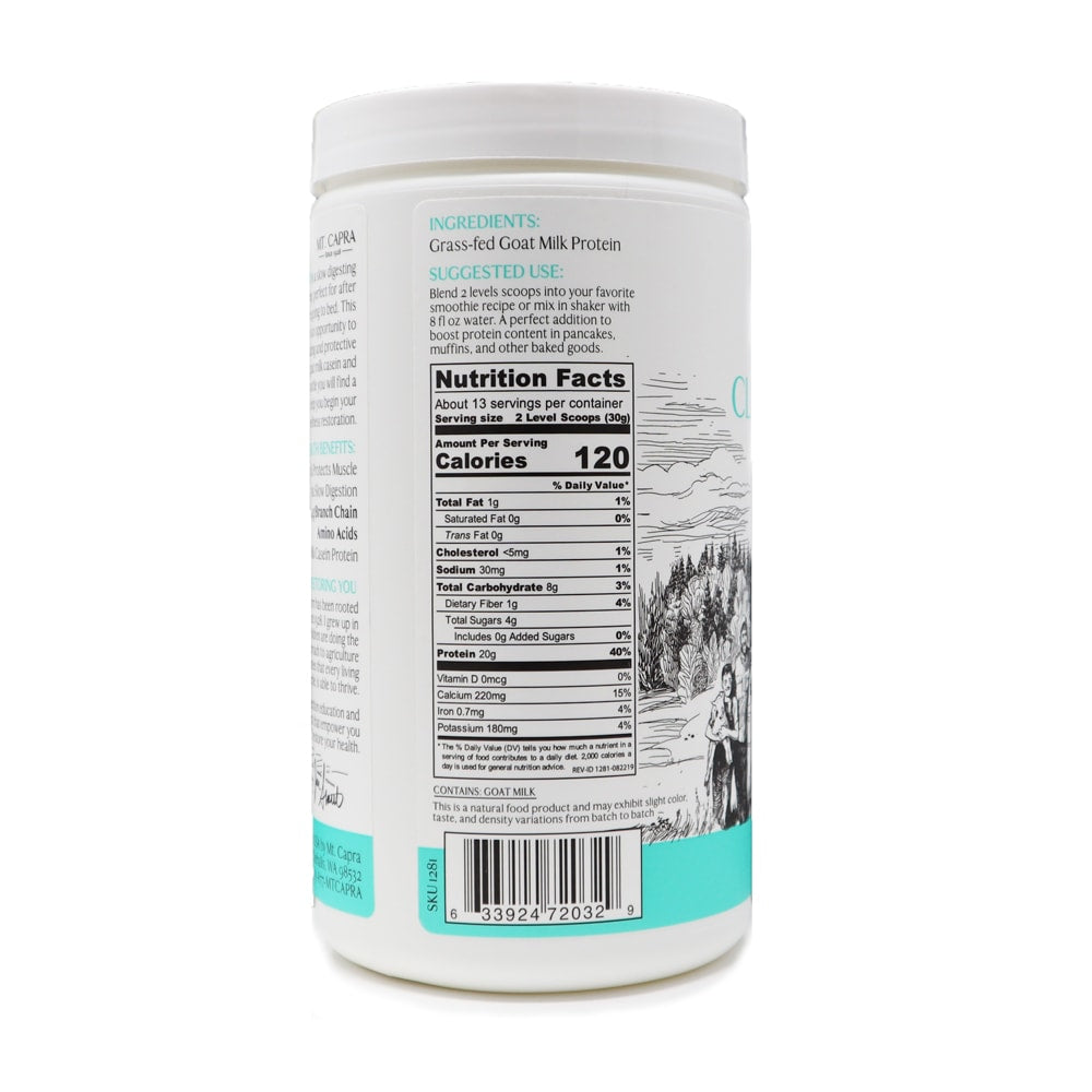 ¡La proteína más limpia del planeta! Mt. Capra ofrece una proteína de leche de cabra completamente natural, elaborada con cabras alimentadas con pasto en el estado de Washington. Esta fórmula está diseñada para proporcionar una nutrición limpia y eficiente, sin ingredientes innecesarios ni aditivos.